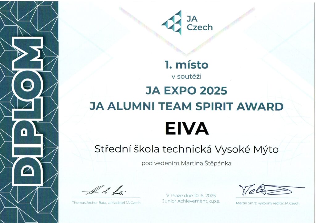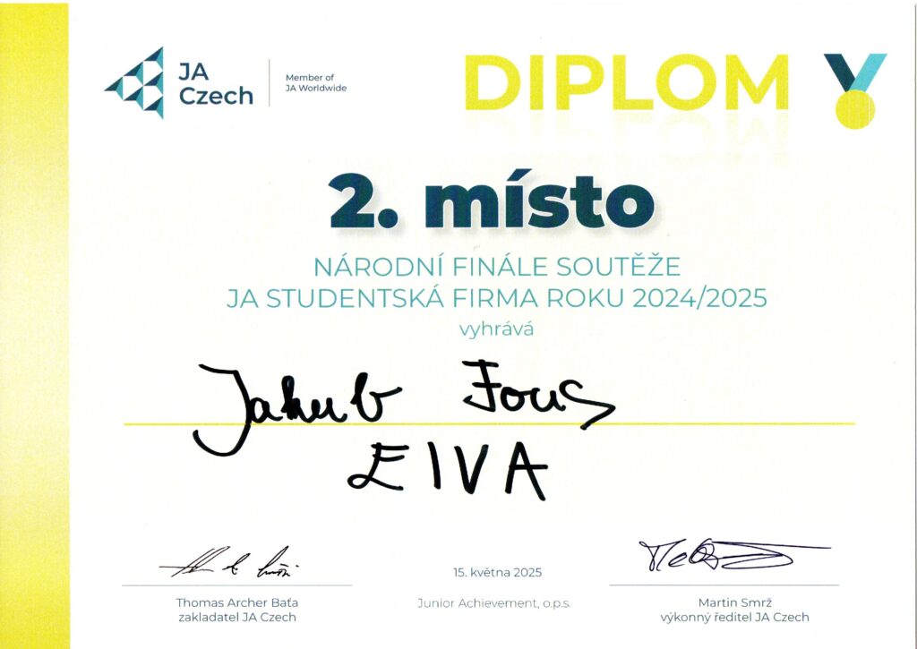 Úspěch v reálném světě vyžaduje odvahu, preciznost a schopnost obstát v konkurenci. V národním finále nejvýznamnější soutěže JA Studentská firma roku 2024/2025 se EIVA probojovala až na stupně vítězů a odnesla si fantastické 2. místo. Toto ocenění, udělené pod záštitou Junior Achievement, je pro nás důkazem, že naše strategie, produkt a byznys plán snesou ta nejpřísnější měřítka odborné poroty a patří k absolutní špičce v rámci celé republiky.